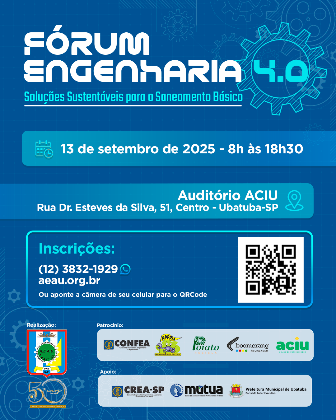 A transformação digital tem impulsionado todos os setores da sociedade — e com a engenharia não seria diferente. A Engenharia 4.0 representa essa nova era: mais conectada, inteligente e sustentável. Nesse contexto, a Associação dos Engenheiros e Arquitetos de Ubatuba (AEAU) promove o Fórum Engenharia 4.0 – Soluções Sustentáveis para o Saneamento Básico, um espaço de diálogo, troca de experiências e construção de caminhos inovadores para um dos maiores desafios do país: o acesso ao saneamento de qualidade. Reunindo profissionais, especialistas e entidades do setor, o fórum convida a todos para refletirem sobre como a tecnologia, a engenharia e a responsabilidade socioambiental podem caminhar juntas em direção a um futuro mais justo, sustentável e eficiente. .