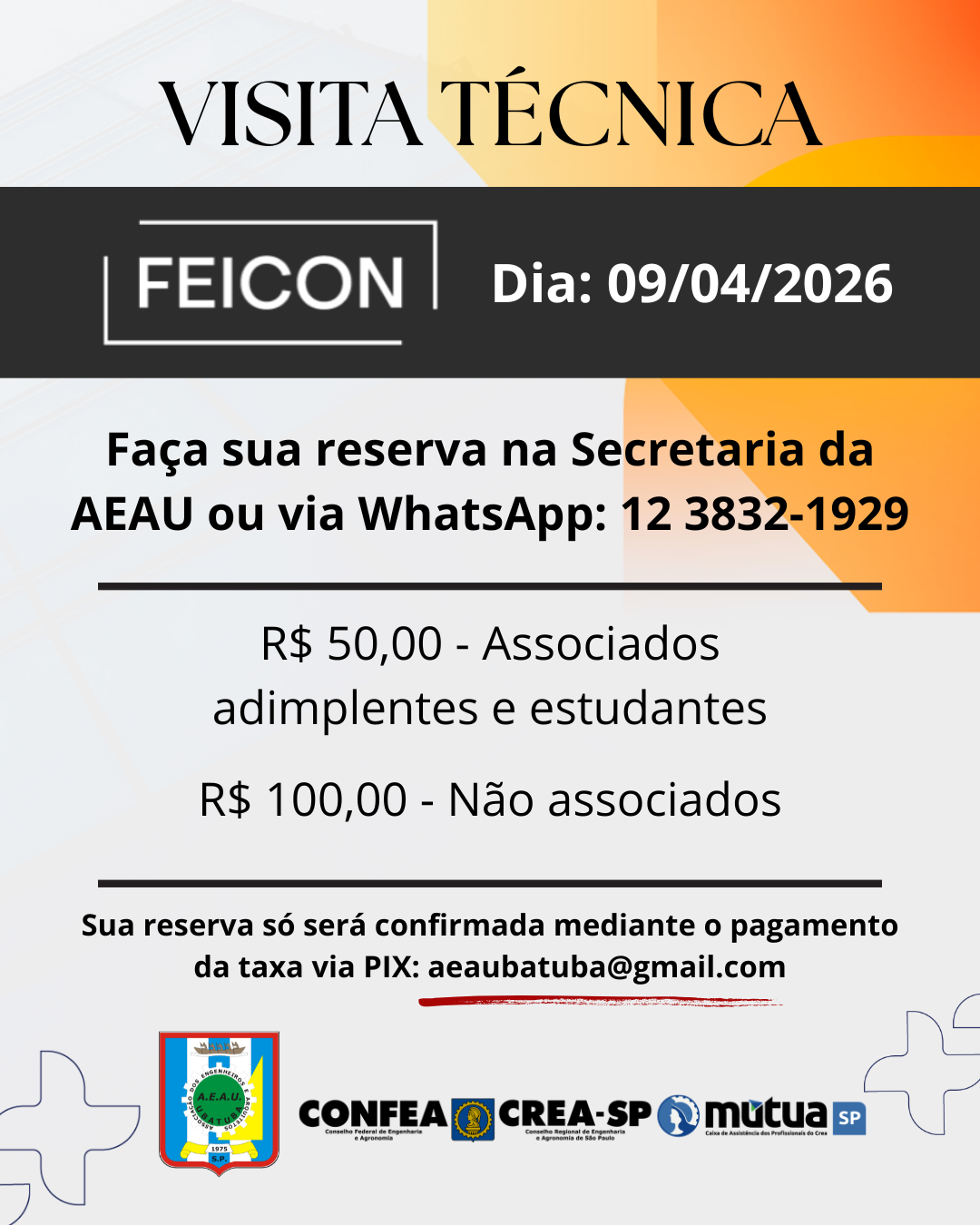 A AEAU tem o prazer de anunciar a realização da visita técnica à FEICON, o principal evento de construção civil e arquitetura da América Latina. A visita acontecerá no dia 09 de abril de 2026 e visa proporcionar aos nossos profissionais e estudantes o contato direto com novos materiais, soluções sustentáveis e networking de alto nível. Para garantir sua presença, os interessados devem entrar em contato com a Secretaria da AEAU ou enviar uma mensagem para o WhatsApp (12) 3832-1929.